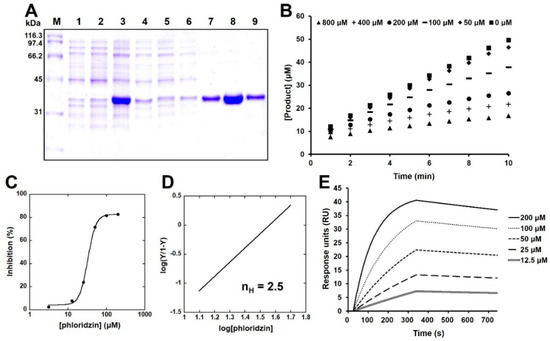 PTP-MEG2 inhibition by phloridzin. (A) Polyacrylamide gel electrophoresis (PAGE) analysis of PTP-MEG2 (molecular weight: 37.8 kDa). M: molecular weight marker, lane 1: total sample before induction, lane 2: supernatant before induction, lane 3: total sample after induction, lane 4: supernatant after induction, lane 5: sample passed through the column after sonication, lane 6: sample after washing the column using lysis buffer, lane 7: sample after washing the column using 10 mM imidazole, lanes 8–9: protein eluted using 100 mM imidazole. (B) Progress curves showing inhibition of PTP-MEG2 by phloridzin at 800 μM (▲), 400 μM (+), 200 μM (●), 100 μM (▬), 50 μM (♦), and 0 μM (■). (C) IC50 values estimated by fitting the sigmoid plot for % inhibition versus various concentrations of phloridzin (200, 100, 50, 25, 12.5, 3.125, and 0 μM). (D) Hill coefficient (nH) was calculated from the slopes of the Hill plots created according to the Hill equation. (E) SPR analysis was performed in running buffer (5% DMSO in PBS) using a Reichert SR7500DC system. Purified PTP-MEG2 was injected for 3 min at a flow rate of 20 μL/min. Interaction analyses were performed by injection of increasing concentrations (12.5 to 200 μM) of phloridzin at a flow rate of 30 μL/min. Association and dissociation signals were monitored for 300 and 420 s, respectively. All experiments were independently repeated at 3 times.