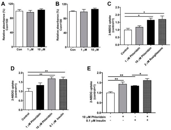 Phloridzin increases glucose uptake. (A,B) 3T3-L1 adipocytes (A) and C2C12 muscle cells (B) were incubated with the indicated concentrations of phloridzin for 2 days and cell viability was assessed by the EZ-Cytox assay kit. (C–E) Differentiated 3T3-L1 preadipocytes (C) and C2C12 muscle cells (D,E) were incubated for 1 h or 72 h (E) with 1 or 10 μM phloridzin, 0.1 μM insulin, or 2 μM rosiglitazone, and then treated with the fluorescent glucose indicator, 2-NBDG, for 30 min. For the detection of 2-NBDG, cells were washed with PBS and the fluorescence intensity was evaluated using a fluorescence microplate reader. All experiments were independently repeated at 3 times. Results are expressed as mean ± SEM. Data were analyzed using a two-tailed unpaired t-test. ** p < 0.01, * p < 0.05 compared to the control group.