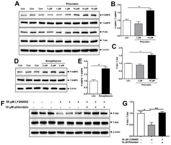 In agreement with this result, incubation with 10 μM phloridzin significantly enhanced Akt phosphorylation compared to the control (Figure 5A,C). Rosiglitazone also remarkably increased AMPK phosphorylation, indicating that the Western blotting experiments were properly performed (Figure 5D,E). These results indicate that phloridzin increases glucose uptake through activation of both AMPK and Akt signaling pathways.