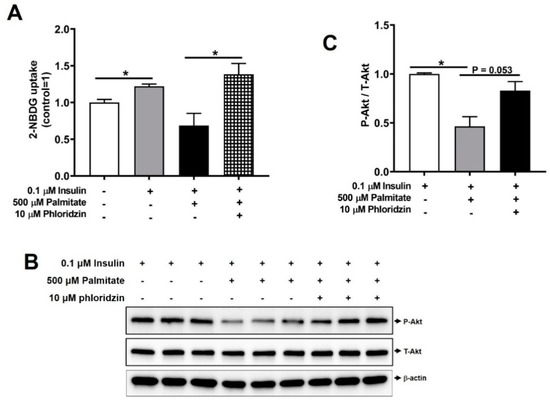 Phloridzin attenuates palmitate-induced insulin resistance in C2C12 muscle cells. (A,B) Differentiated C2C12 muscle cells were treated with 10 μM phloridzin or 500 μM palmitate for 48 h and then incubated with and without 0.1 μM insulin for 30 min. Cells were analyzed by glucose uptake (A) or Western blotting (B). (C) Quantification of phospho-Akt/total-Akt using the ATTO image analysis software. All experiments were independently repeated at 3 times. Results are expressed as mean ± SEM. Data were analyzed using two-tailed unpaired t-test. * p < 0.05 compared to the control group.