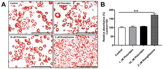 We next elucidated the effect of phloridzin on lipid accumulation. 3T3-L1 preadipocytes were differentiated in the presence of phloridzin or rosiglitazone. On day 6 of differentiation, the degree of adipocyte differentiation was evaluated by Oil Red O staining. In addition, we performed quantification of lipid accumulation. To this end, Oil Red O dye was eluted by incubation with isopropanol and the absorbance was measured using a microplate reader. Adipogenesis is associated with CCAAT/enhancer-binding protein α (C/EBPα) and peroxisome proliferator-activated receptor-γ (PPARγ) [25]. Rosiglitazone, a PPARγ agonist, is an insulin-sensitizing agent with side effects such as rodents and human weight gain [26,27]. In line with this, we found that rosiglitazone significantly stimulated the formation of lipid droplets compared to the control (Figure 7A,B).