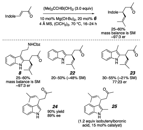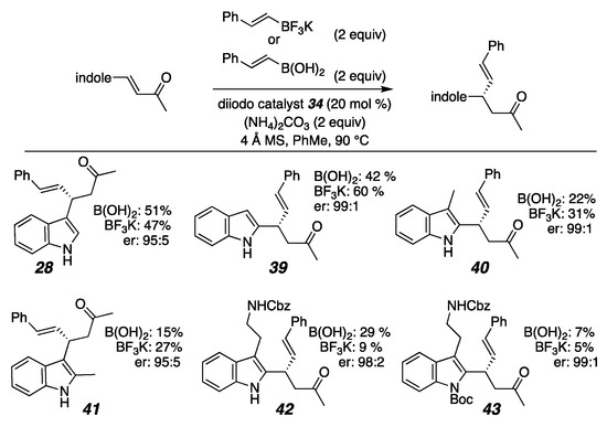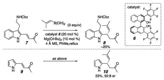 - Lundy, B.J.; Jansone-Popova, S.; May, J.A. Enantioselective Conjugate Addition of Alkenylboronic Acids to Indole-Appended Enones. Org. Lett. 2011, 13, 4958–4961. [Google Scholar] [CrossRef]