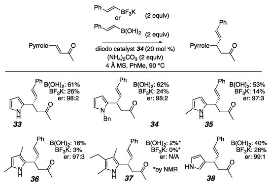 - Shih, J.-L.; Nguyen, T.S.; May, J.A. Organocatalyzed Asymmetric Conjugate Addition of Heteroaryl and Aryl Trifluoroborates: A Synthetic Strategy for Discoipyrrole, D. Angew. Chem. Int. Ed. 2015, 54, 9931–9935. [Google Scholar] [CrossRef] [PubMed]