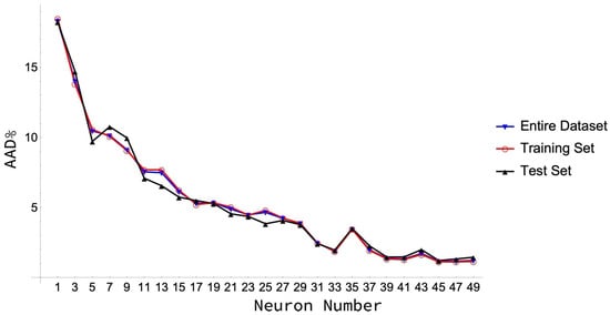 The next step is to determine the appropriate number of neurons that must be placed in each hidden layer. In particular, as shown in Figure 1, a minimum in the AAD values for the training and test sets is reached for 41 neurons. This means that a set of 206 coefficients (weights and biases) is determined in the training process, a number that can be regarded as low [38] when compared to the 2051 surface tension data considered here. This high number of neurons in the hidden layer is needed to obtain a low AAD value with a great majority of data reproduced with a PD below 10%. This low PD is not so easy to reach in the case of the surface tension, as it tends to reach zero as the temperature approaches the critical point.