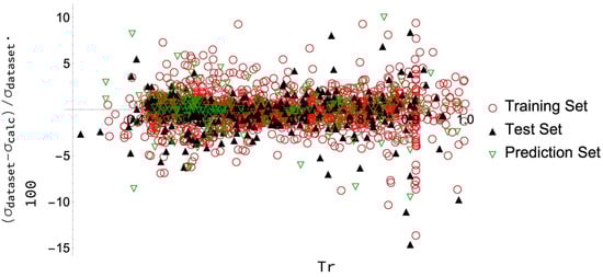 It is also important to analyze the behaviour of the PD values for each datum. As seen in Figure 2, the results for the prediction data set are similar to those for the training and test data sets. For the complete data set, only a few data points (indeed, only five out of the 2051 collected) have deviations greater than 10%, and these points mainly correspond to high temperatures. As remarked above, there are two principal reasons behind these greater deviations: (i) At the critical temperature, the surface tension must be null, and then a little absolute deviation between the calculated and database values can produce a very high PD (since the denominator is so small); (ii) for a given fluid, there may be different and not matching values for the same temperature coming from different or even the same sources. The ANN (or any other alternative model) will only give one value so that it is impossible to reduce the deviation of all the points to low values. In the case of slight differences between the values at this temperature, the corresponding PDs will be small, but some cases might occur where this percentage difference is considerable. Some examples will be presented at the end of this section.