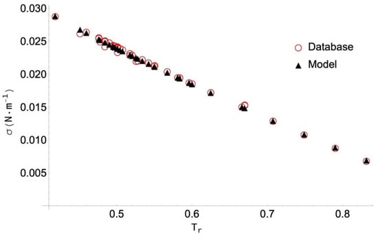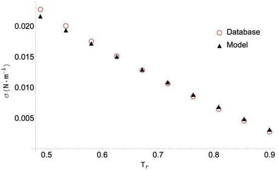 The highest PDm value (14.53%) is obtained for neopentanoic acid, despite the corresponding AAD below 5%. As in the previous case, the 10 data selected have been obtained by DIPPR with the use of Sugden’s method [10], so no experimental values are included. As shown in Figure 3, the behaviour of the data is homogeneous, and the ANN model reproduces them very well. In this case, the greatest deviations are due to the fact that some of the data is collected located near the critical point, and then the surface tension value is practically zero. In particular, the 14.53% value corresponds to the data at the highest temperature (Tr = 0.90), even though the difference between the collected and the calculated values is only 0.0004095 N/m (something that cannot be clearly appreciated in the figure).