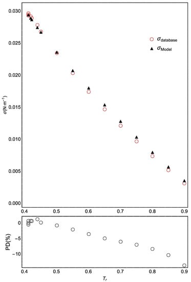 where σi and Ti are the surface tension and temperature, respectively, σ(Ti) is the value given by each model, and N represents the number of data. Another useful parameter is the maximum absolute value of the PDi, denoted by PDm, which gives information on the model’s worst prediction. This PDm value is usually found near the critical temperature, where the values of σi go to zero. Thus, in the high-temperature range, a small absolute deviation can lead to a high PD value. This fact is common for any model that could be used.