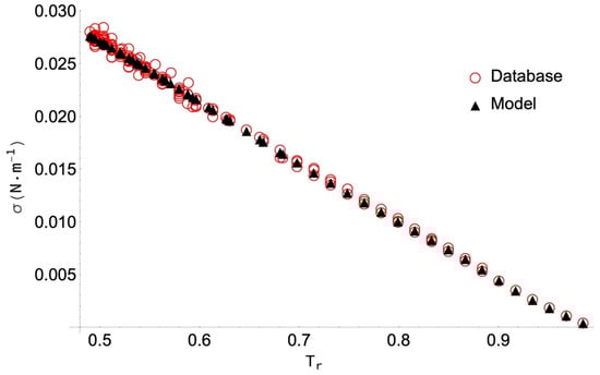 Mulero et al. [23] highlighted the main limitations of the previous analytical models. In most cases, few data are used for each acid, and they are usually taken from a single source. Moreover, the temperature ranges considered are narrow. To avoid this situation, they used different sources (databases, books, and published papers), and collected and screened the available data carefully. As a result, they built a new database containing 2066 data for 99 organic fatty acids, including aliphatic, carboxylic, and polyfunctional acids. Then, they proposed empirical correlations which contain adjustable coefficients for each of the 99 organic acids considered. In particular, the analytical expression for the correlations is the same as that used in the REFPROP NIST program [29], with the inclusion of two or four adjustable coefficients for each fluid. The proposed correlations reproduce the data with individual absolute percentage deviations below 1.6% and maximum percentage deviations below 8% [23]. Despite the accuracy of the individual correlations, the coefficients have to be obtained for each fluid separately. Moreover, the input properties needed in the general correlations or models are not always available, and the analytical expression for the temperature dependence, generally consisting of a power law with a fixed exponent, limits their applicability in the sense that they cannot give good results simultaneously for both low- and high-temperature ranges [24,25]. Finally, as shown in Section 3, no general analytical model is present for the surface tension of a large number of organic acids with acceptable accuracy.
