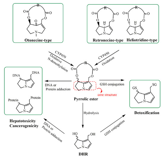 PA poisoning cases have been extensively reported [11,12,13] and long-term exposure to PAs can cause hepatic veno-occlusive disease (HVOD) and human hepatic sinusoid occlusion syndrome (HSOS) [14]. It is generally accepted that PAs themselves are not toxic and need hepatic cytochrome P450 monooxygenases (CYP450, mainly CYP3A4) to mediate the metabolic activation. As illustrated in Figure 1, three types PAs can be converted into 6,7-dihydro-7-hydroxy-1-hydroxymethyl-5H-pyrrolizidine (DHP) esters, which can be further converted into DHP by hydrolysis [1,15]. The pyrrolic metabolites, DHP esters and DHP, are highly reactive bifunctional alkylating agents, once formed can rapidly bind to nucleophilic groups in cellular proteins and DNA, including DNA binding, DNA cross-linking, DNA-protein cross-linking [7,15], and then may result in the acute and chronic hepatotoxicity, genotoxicity and carcinogenicity. Similar to DHP esters, DHP can also bind with GSH, DNA or proteins to generate pyrrole-GSH conjugates, pyrrole-protein adducts or pyrrole-DNA adducts, respectively, leading to detoxification, hepatotoxicity or carcinogenicity [7,16].