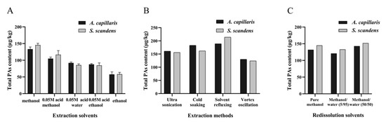 Effect of five different extraction solvents (n = 3) (A), four different extraction methods (B), and three different redissolution solvents (C) on the total PAs content of herbal medicines in A. capillaris (dark gray bars) and S. scandens (light gray bars).