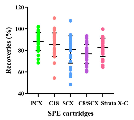 Five different kinds of solid phase extration (SPE) cartridges (500 mg/6 mL) were investigated: Cleanert PCX, SCX, C18, C8/SCX (all from Agela Technologies, Tianjin, China) and Strata-X-C (Phenomenex, Guangzhou, China), and the recoveries were tested by adding a matrix free mixed acid standard solution to each of the five SPE cartridges, the results were shown in Figure 3 (more details see Table S6).