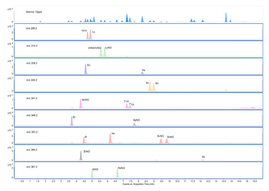 Multiple reaction monitoring (MRM) chromatograms of nine sets of isomers with a mixed standard of PAs (10 μg/kg) by liquid chromatography-tandem mass spectrometry (LC-MS/MS). For each pair the molecular mass and compound name (Im: intermedine; Ic: indicine; Ly: lycopsamine; ImNO: intermedine N-oxide; IcNO: indicine N-oxide; LyNO: lycopsamine N-oxide; Eu: europine; He: heliotrine; Sv: senecivernine; Sn: senecionine; McNO: monocrotaline N-oxide; 7-Im: 7-acetylintermedine; 7-Ly: 7-acetyllycopsamine; Er: erucifoline; SpNO: seneciphylline N-oxide; Jb: jacobine; Re: retrorsine; SvNO: senecivernine N-oxide; SnNO: senecionine N-oxide; ErNO: erucifoline N-oxide; JbNO: jacobine N-oxide; ReNO: retrorsine N-oxide) were shown.
