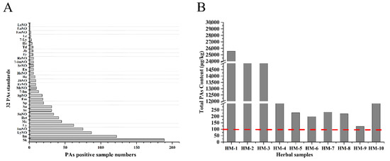 The distribution of 32 PAs standards in 271 PA-positive herbal medicinal materials (A), senkirkine, intermedine and lycopsamine-N-oxide were the top three most frequently found PAs, and (B) showed top ten herbal medicines with total PAs content above 100 μg/kg, namely HM-1(Arnebia euchroma): 25567.4 μg/kg; HM-2 (Tussilago farfara): 17,600.1 μg/kg; HM-3 (Eupatorium fortune): 16,943.6 μg/kg; HM-4 (Eupatorium lindleyanum): 1863.6 μg/kg; HM-5 (Senecio scandens): 233.6 μg/kg; HM-6 (Laggera pterodonta): 229.0 μg/kg; HM-7 (Artemisia scoparia): 220.6 μg/kg; HM-8 (Cassia angustifolia): 198.5 μg/kg; HM-9 (Euphorbia hirta): 121.9 μg/kg; HM-10 (Gynura japonica): 531.0 μg/kg.