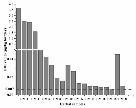 Based on this, the 0.007 μg/kg bw/day was adopted as the tolerable maximum levels of exposure for PAs. Supplementary Material presented the EDI values of total PAs calculated for the consumption of positive herbal samples [30]. The values ranged from 4.28 × 10−6 to 3.652 μg/kg bw/day. As shown in Figure 6, the EDI values of all samples were well below the dose range of 1–3 mg PA/kg bw/day, these results indicated that the herbal consumers were not at risk for acute toxicity of PAs when consuming for short periods of 4 days up to 2 weeks. However, there were 20 herbal materials with EDI values above 0.007 μg/kg bw/day, which indicated that these medicines may have underlying toxicity. From the chart, the daily intake of PAs from sample HM-1 (3.652 μg/kg bw/day) was more than 521 times the baseline, followed by sample HM-2 (2.514 μg/kg bw/day), HM-3 (2.421 μg/kg bw/day), and HM-4 (1.597 μg/kg bw/day), at 359, 346, and 228 times, respectively.