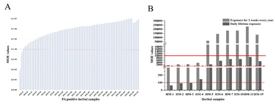 When considering chronic exposure, the risk assessment was conducted on 271 PA-positive herbal medicines, and 10 out of 271 (3.6%) samples were below 10,000, and the MOE values for sample A. euchroma (64.8), T. farfara (94.2), and E. fortunei (97.9) were even lower than 100, indicating there should be a priority for risk management upon daily lifetime exposure. However, people tend to use these products for a short-term treatment. Hence, here we adopted Haber’s rule to evaluate the risk for shorter-than-lifetime exposure (two weeks every year during a lifetime) and correspondingly the MOE values were 26 times higher than the lifetime daily exposure MOE values. Accordingly, there were still four out of the 271 (1.48%) herbal samples with MOE values < 10,000, namely A. euchroma (1687.0), T. farfara (2450.7), E. fortunei (2545.7), and E. lindleyanum (3857.4), indicating that these herbals may have underlying toxicity, and the strict regulatory and quality control should be carried out to reduce the related health risk for consumers.