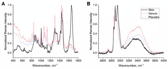 Figure 1 shows the normalized Raman spectra of untreated human SC measured in vivo in 3.4 µm depth (black), the verum (red) and placebo (blue) formulations in the fingerprint (FP, Figure 1A) and high wavenumber (HWN, Figure 1B) regions. Raman spectra of both formulations are visually similar and it is impossible to conclude which is the verum and which the placebo. Since both formulations have a strong contribution in the 2800–3000 cm−1 range, which is specific to lipids and keratin in the SC, the calculation for the lipid and total water concentration, which are normalized to the keratin concentration, could be affected in the superficial depths [47].