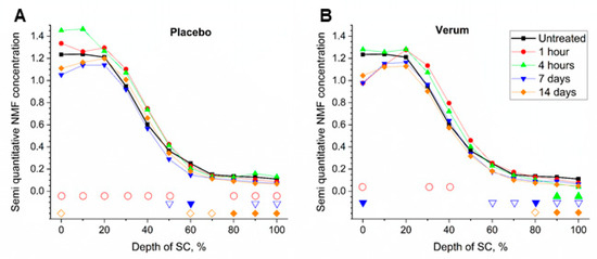 For clarity, all diagrams are shown without error bars. Significant differences (p < 0.05) between treated and untreated skin are marked at the bottom of the diagrams in empty shapes and strongly significant differences (p < 0.01) are marked in filled shapes for different SC depths. The effects of multiple testing, resulting in increased Type-I error, were neglected.