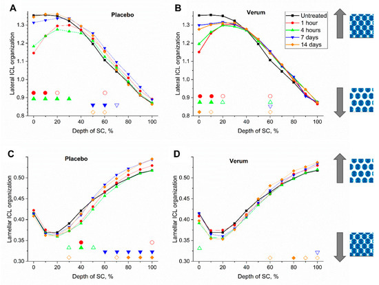Mean lateral (A,B) and lamellar (C,D) organization of intercellular lipids (ICL) of all subjects before (untreated, black squares) and 1 h (red circles), 4 h (green upward triangles), 7 days (blue downward triangles) and 14 days (orange diamonds) after beginning of the treatment with the placebo (A,C) and verum (B,D). The signals are normalized to the thickness of the SC (0–100%). Significant differences (p < 0.05) are marked below in empty shapes, strongly significant differences (p < 0.01) in solid shapes.