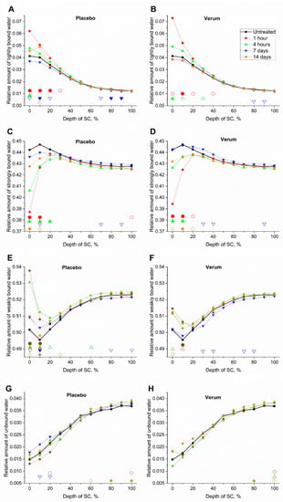 Relative mean amount of tightly bound—(A,B), strongly bound—(C,D), weakly bound—(E,F) and unbound water (G,H) of all subjects before (untreated, black squares) and 1 h (red circles), 4 h (green upward triangles), 7 days (blue downward triangles) and 14 days (orange diamonds) after beginning of the treatment with the placebo (A,C,E,G) and verum (B,D,F,H). The signals are normalized to the thickness of the SC (0–100%). Significant differences (p < 0.05) are marked below in empty shapes, strongly significant differences (p < 0.01) in solid shapes.