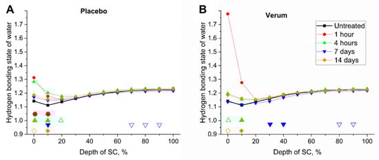 Mean hydrogen bonding state of water (weakly/strongly bound water ratio) of all subjects before (untreated, black squares) and 1 h (red circles), 4 h (green upward triangles), 7 days (blue downward triangles) and 14 days (orange diamonds) after the beginning of the treatment with the placebo (A) and verum (B). The signals are normalized to the thickness of the SC (0–100%). Significant differences (p < 0.05) are marked below in empty shapes, strongly significant differences (p < 0.01) in solid shapes. A higher hydrogen bonding state determines a higher amount of more loosely bound water, where the water is most loosely bound with surrounding molecules.