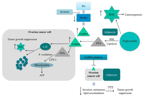 Proposed model of FABP4 role in the ovarian cancer cell [75,78] by Baczewska et al. SU6656—SRC-inhibitor; L.D—lipid droplets; FFA—free fatty acids; HSL—hormone-sensitive lipase.