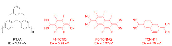 Chemical structures of the compounds used in the doped hole transporting layer (HTL). Ionization energy (IE) of poly[bis(4-phenyl)(2,4,6-trimethylphenyl)amine] (PTAA) and the electron affinity (EA) of each dopant, i.e., 2,3,5,6-tetrafluoro-7,7,8,8-tetracyanoquinodimethane (F4-TCNQ), 1,3,4,5,7,8-hexafluoro-11,11,12,12-tetracyanonaphtho-2,6-quinodimethane (F6-TCNNQ), and 11,11,12,12-tetracyanonaphtho-2,6-quinodimethane (TCNH14), were indicated correspondingly.