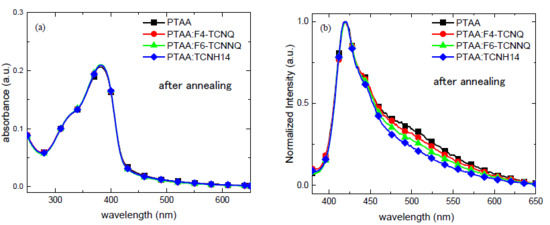 The chemical structures of PTAA and the dopants are shown in Figure 1, where the ionization energy (IE) of PTAA [29] and the EAs of dopants [23,24,30] are noted. Unlike TCNH14, F4-TCNQ and F6-TCNQ exhibited the more suitable LUMOs in the proximity of the HOMO level of PTAA, which may allow more efficient charge transfer when mixed together. To unravel the interaction between the dopants and the HTL PTAA, the absorbance and emission spectra of the four different PTAA films spin-coated on the quartz substrates were measured. As shown in Figure 2a, neither obvious charge transfer complexes (CTCs) nor ion absorption could be found in any doped HTL in the visible range, even though F4-TCNQ and F6-TCNNQ had the well-matched EAs with the IE of PTAA. This may be attributed to the weak and imperceptible charge transfer or the highly absorptive polymer PTAA.
