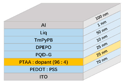The indium-tin-oxide (ITO) substrates were cleaned with acetone and ethanol consecutively in an ultrasonic bath for 10 min. After treating in the UV-ozone chamber (SenLights Corporation, Osaka, Japan) for 20 min, the substrates were spin-coated (KW-4A CAS, Beijing, China) with a layer of PEDOT:PSS, which was annealed at 120 °C for 10 min. Then the samples were loaded in the N2-filled glovebox (MBraun, München, Germany). The doped hole transporting layer was prepared by mixing the dopant (2 mg/mL) and PTAA (5 mg/mL) in chlorobenzene solution to meet the weight ratio of 96:4 and then spin-coated at 1000 rpm for 30 s onto the hole injecting layer PEDOT:PSS. After baking the hole transporting layer at 100 °C for 10 min on a hot plate, the emitting layer was spin-coated at 1000 rpm for 30 s and then annealed at 50 °C for 10 min before being loaded into the high-vacuum chamber (MB-200MOD MBraun, München, Germany). Then the hole blocking layer DPEPO, the electron transporting layer TmPyPB, the electron injection layer Liq, and the cathode Al were sequentially deposited in a high-vacuum chamber. Finally, all the samples were encapsulated with the UV curable glue before taken out from the glovebox.