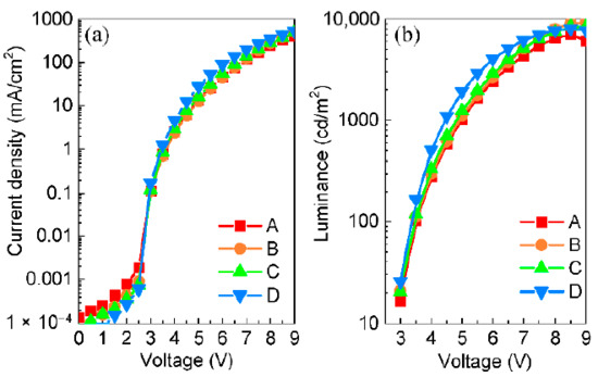 (a) Current density–voltage and (b) luminance–voltage curves of the devices.