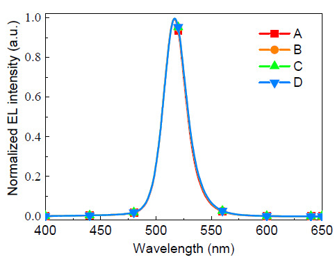 Figure 5 illustrates the normalized EL spectra of the four devices. All the devices had a same peak at 516 nm, accompanied with the small full-width at half-maximum (FWHM) of about 25 nm. The identical EL profiles of the devices indicate that all the radiative excitons originate from the green PQDs, although the HTLs are emissive as shown in Figure 2b.