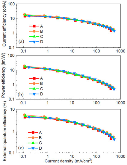 As shown in Figure 4a, at a current density of 10 mA/cm2, device B with the F4-TCNQ-doped HTL exhibited the slightly increased driving voltage from about 4.80 V to 4.85 V, compared with the reference device A with the neat PTAA as the HTL. In contrast, the driving voltages of devices B and C corresponding to F6-TCNNQ and TCNH14 used as the dopants were only 4.70 V and 4.38 V, respectively, at the same current density mentioned above. It is indicative that the devices with the doped HTL display small ohmic loss. It is worth mentioning that device D with TCNH14 was most conductive when the driving voltage was above 3 V. More specifically, device D had a current density of 27.9 mA/cm2 under 5.0 V, which was a factor of 2 higher than that of device A with only 13.5 mA/cm2. At the same driving voltage, devices B and C had current densities of 12.7 and 16.0 mA/cm2, respectively.