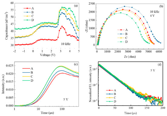 (a) Capacitance–voltage curves, (b) Nyquist plot recorded at 10 kHz, (c) rising time, and (d) transient EL after pulse off at 5 V of the devices.