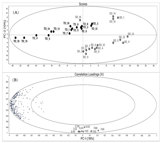 Score plot (A) and correlation loadings (B) of the mean-centered principal component analysis (PCA) performed using the reduced bucket table of 1H NMR spectra of the water extracts of Hibiscus calyces. Gray: SD; black: TD. The numbers in the correlation plot indicate the chemical shift of the buckets (ppm).