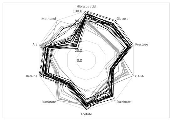 SD samples from locations 13–16 should be discussed separately. As shown in Table 4 and the radar presentation of the calyces’ compositions (Figure 3, gray dashed lines), this group of samples has a metabolic composition that is rather different from the other SD samples—a higher sugar and betaine content and a lower amount of GABA, fumarate, and methanol. As discussed in Section 3.5, the decrease in sugar content and the increase in GABA and fumarate during SD treatment might be explained by the possible fermentation of the calyces biomass during drying. Therefore, SD samples can be divided into two groups: samples from locations 1–12 (possible fermentation during drying) and samples from locations 13–16. This division reduces the average standard deviation of the metabolite concentrations for the SD 1–12 group to 10.5%, and for SD 13−16 samples to 7.7% (compared to the 18.1% average standard deviation for all SD samples).