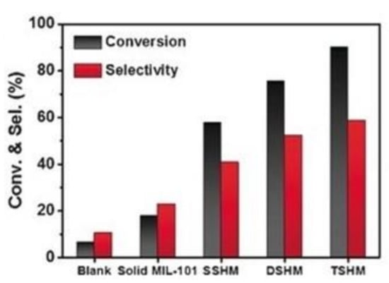 Liu et al. reported the first example of a catalytic system consisting of multi-shelled hollow MOFs (MSHMs) [25]. The hierarchically porous structures of MSHMs have received much attention and provided advanced applications in several fields [26]. The authors developed a method to fabricate hollow MIL-101 crystals with one, two or three shells, designated as SSHM, DSHM and TSHM, respectively, via step-by-step crystal growth and subsequent etching processes (Scheme 2). The accurate control of the size of the cavity and shell thickness was achieved by regulation of the etching time and the reactant concentration for each layer. Figure 3 illustrates the conversion and selectivity for the oxidation of styrene over solid MIL-101, SSHM, DSHM, and TSHM crystals. The hollow MIL-101 exhibited a much higher activity than the MIL-101 crystal, being related to the number of layers in the MSHMs. A 90% styrene conversion was obtained after 12 h for TSHM, while, in comparison, 18% of styrene conversion was obtained using solid MIL-101.