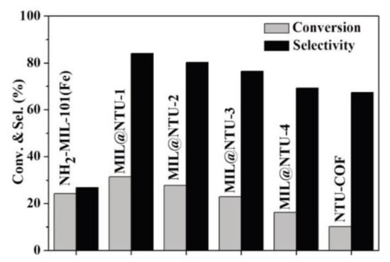 This high selectivity was imputed to the synergistic effect between the MOF core and COF shell. To address the catalytic stability of MIL@NTU-1, recycling experiments were performed for four successive cycles. No obvious changes in terms of the catalytic activity and selectivity were observed for the catalyst, maintaining its octahedral morphology and rough surface.