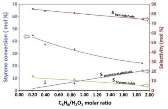 Effect of styrene (C8H8)/H2O2 molar ration on styrene conversion and selectivity to benzaldehyde, styrene oxide and phenylacetaldehyde. Reaction conditions: 0.4 g of Co-ZSM-11, T = 60 °C; 350 rpm. Reproduced with permission from ref. [42], Copyright (2013), Elsevier B.V., Amsterdam, The Netherlands.