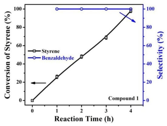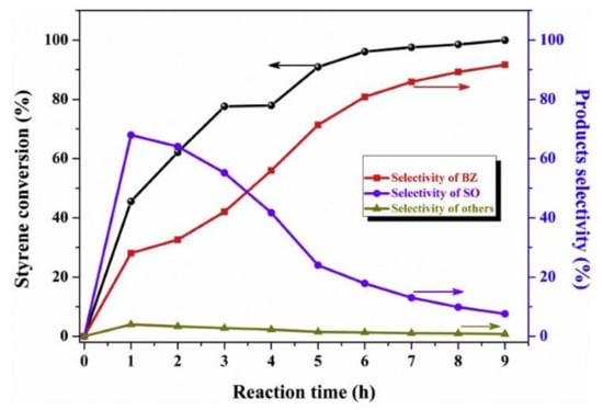 The effect of reaction time on the selective oxidation of styrene to benzaldehyde on styrene conversion and benzaldehyde selectivity. Reproduced with permission from ref [47]. Copyright (2018) Elsevier Inc., Amsterdam, The Netherlands.