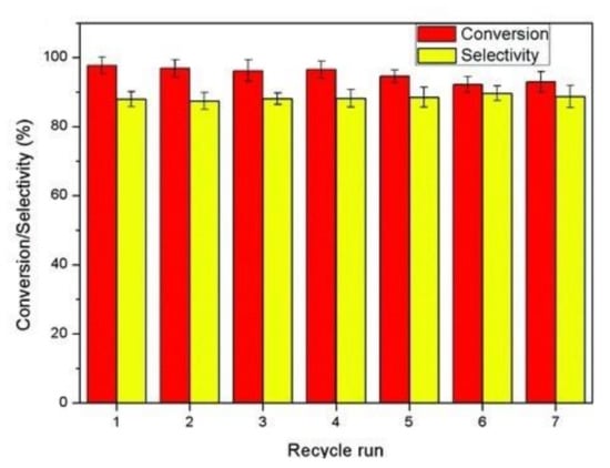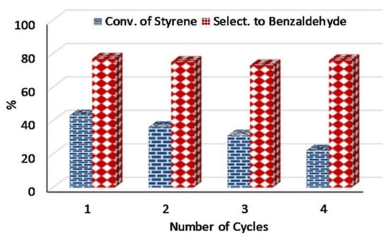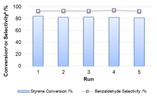 In 2018, Zou et al. explored the catalytic performance of vanadium pentoxide-modified graphitic carbon nitride (V2O5/g-C3N4) composites in the oxidation of styrene [69]. The excellent performance of g-C3N4 materials as catalysts is anticipated given their resemblance to graphene, which confers their high thermal and chemical stability, with a simply tailorable structure [70]. The V2O5/g-C3N4 composites were prepared with different weight ratios (1–5%) of V2O5 loads, obtained through a wet impregnation method and calcination and denoted as VC-1 to VC-5 according to the V2O5 load. These materials were investigated as catalysts for the oxidation of styrene, as well as bare V2O5 and g-C3N4, studied for comparison. The VC-3 composite showed the best catalytic performance for the styrene oxidation reaction, obtaining 88% selectivity to benzaldehyde at 99% of styrene conversion under visible light irradiation. Other styrene substrates were also selectively converted to the corresponding aldehydes, achieving high yields (up to 92%) using this catalytic system. The recyclability of the catalyst was assessed through a series of seven reuse cycles using VC-3 as a catalyst under optimal conditions (Figure 14), without an obvious decrease of activity. A mechanism was postulated for the oxidation reaction with H2O2, following a •OH radical pathway.