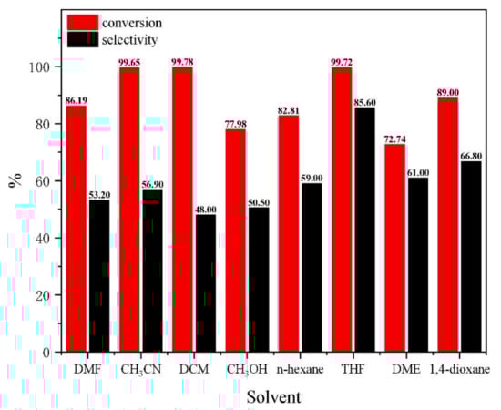 Conversion of styrene and selectivity of products in the selective oxidation of styrene with POMOF1 as a catalyst. (Reaction conditions: styrene (0.25 mmol), H2O2 (1 mmol), catalysts (0.028 mmol), and acetonitrile (2 mL) at 70 °C. Reproduced with permission from ref [34]. Copyright (2018), American Chemical Society, Amsterdam, The Netherlands.