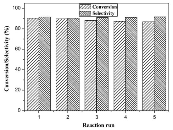 The conversion rate observed for TSHM was much higher than that of solid MIL-101, pointing out that the hollow multi-shelled structure could substantially enhance the catalytic performance. Additionally, the MSHMs displayed an enhanced benzaldehyde selectivity in comparison to solid MIL-101. The catalytic results for the oxidation of styrene highlighted the importance of the design of the MSHMs to the outstanding catalytic results when compared to that of the solid nanocrystals. The recyclability of TSHM was also investigated by the authors, which observed relation between conversion and selectivity to benzaldehyde as a function of the number of consecutive catalytic cycles (Figure 3). No significant changes in terms of the catalytic activity and selectivity after five successive cycles of reuse were reported.