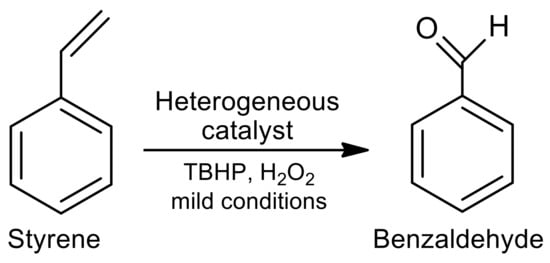 Benzaldehyde is one of the most important and versatile organic compounds in the industry. This simple compound is widely used as an important intermediate for the synthesis of perfumes, epoxy resins, plasticizers, drugs, sweeteners and fine chemicals [1]. The industrial production of benzaldehyde is currently achieved by two processes, the catalytic oxidation of toluene to benzoic acid with oxygen and the hydrolysis of benzyl chloride [2,3]. However, both synthetic routes present important drawbacks (high temperatures and reaction times and/or production of chloride wastes), leading to low catalytic conversion and poor benzaldehyde yield (up to 20%) and selectivity. The selective oxidation of styrene is, therefore, considered a more appealing process as opposed to more complex methods, harsh conditions, and toxic waste disposal of the implemented procedures. The development of sustainable, effective catalytic systems for benzaldehyde production is hence a task of high significance in both academic and industrial fields. Owing to its simple reaction procedure and environmental-benign nature, the direct oxidation of styrene to benzaldehyde using environmentally friendly oxidants (Scheme 1) has, therefore, aroused much attention. For this matter, many kinds of homogeneous and heterogeneous catalysts have been investigated for the selective oxidation of styrene to benzaldehyde. The use of catalysts in the homogeneous phase, however, is associated with some disadvantages, such as high cost, difficult separation, and low recycling performance, limiting their further application in the catalytic process. Heterogeneous catalysts are in general considered to be more promising than their homogeneous counterparts due to their easy separation and recycling, although some of these can also pose important issues, such as high-cost, complex or time-consuming preparation procedures and low catalytic performance.