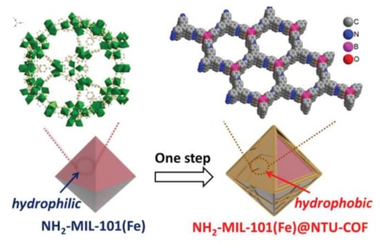 Cai et al. prepared stable core–shell composites, consisting of a mesoporous MOF, NH2-MIL-101(Fe) as a core and a mesoporous covalent organic frameworks (COFs) shell denoted as MOFs@COFs for the oxidation of styrene [27]. The integration of MOFs and COFs in this new type of MOF@COF core–shell material, presenting high crystallinity as well as a hierarchical pore structure, was recently reported [28]. These materials were synthesized via a one-step modification, enabling hierarchical crystalline porous materials with adjustable hydrophilic–hydrophobic properties (Scheme 3). The composite NH2-MIL-101(Fe)@NTU obtained by a covalent linking process of NUT-COF-1 (NTU) (NTU: Nanyang Technological University) kept his retentive crystallinity with a hierarchical porosity and showed a considerably enhanced conversion and selectivity for styrene oxidation. The pore environment and the hydrophilic–hydrophobic properties of the hydrophobic NTU-COF shell were successfully modified, boosting the radical nature mechanism path after combining the hydrophilic MOF nanocrystals with the hydrophobic COFs shell.