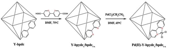 Zhang et al. prepared a series of PdCl2 moiety-decorated Y6-MOFs using a post-synthetic strategy [35,36] for application as single-site catalysts for the selective oxidation of styrene [37]. In particular, the incorporation of the functional organic linker, H2bpydc (2,2′-bipyridine-5,5′-dicarboxylic acid), into Y(III)6 clusters-supported MOF, [(CH3)2NH2]2 [Y6(μ3-OH)8(bpdc)6] (bpdc = 4,4′-biphenyl dicarboxylic acid) via a postsynthetic ligand exchange, followed by Pd(II) introduction to enhance the density of single sites (Scheme 5).