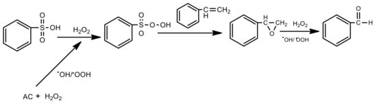 The presence of AC, porous carbon materials, in the selective oxidation of styrene to benzaldehyde catalyzed by p-toluenesulfonic acid (p-TsOH), was investigated by Li et al. [68]. The authors investigated the influence of several reaction parameters, as reaction time, temperature, catalyst mass, and styrene/H2O2 molar ratios, in the catalytic activity. A strong promoting effect of AC on the p-TsOH/H2O2 system was found as well as the influence of AC and p-TsOH ratios in the catalytic results.