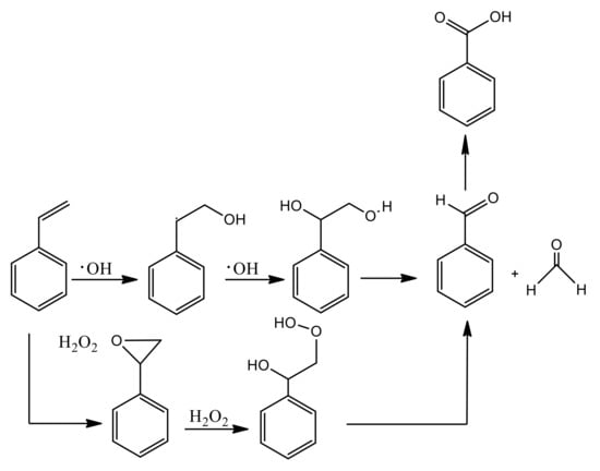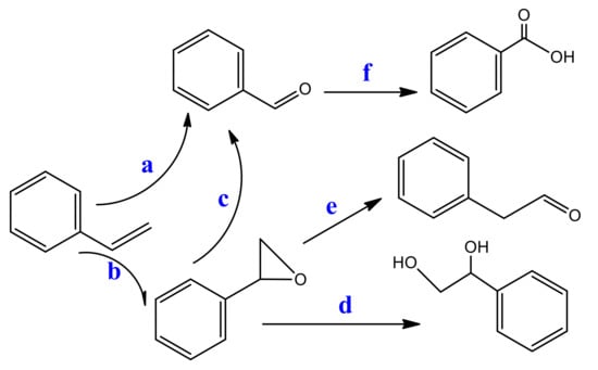 In this study, showing similar yields for oxidation products, the formation of benzaldehyde is achieved by a two-step mechanism that starts with the attack of (CH3)3OO• on styrene, in accordance with a reported mechanism for the oxidation reaction using TBHP [17].