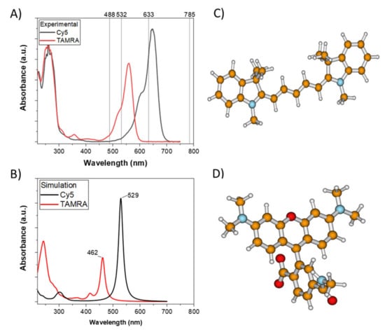 (A) UV-Vis spectra of the dyes free in solution, and the respective excitation wavelengths used for Raman analysis. (B) Computed UV-Vis spectra obtained from corresponding TD-B3LYP vertical transition energies and oscillator strengths. Geometries obtained for the molecular models used in this work for (C) Cy5 and (D) TAMRA, optimized at the B3LYP+D3/6-311++G** (+PCM (water)) level of theory (color code: H = white, C = orange, N = blue, O = red).