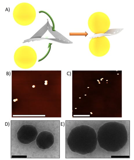 The schematic of the nanoparticle dimer self-assembly using DNA origami nanotriangles is given in Figure 2A. The nanotriangle is modified in a manner to present sticky ends on both sides of the triangle border so that two DNA-modified nanoparticles can hybridize, one on each side, sandwiching the DNA origami between them. AFM imaging allows the fast and precise observation of the nanostructure shape and size. The AFM images of the DNA nanotriangles showed the correct formation of the nanostructure (data not shown) [23,24]. The AFM images of the self-assembled nanoparticle dimers are shown in Figure 2B for 60 nm dimers and Figure 2C for 80 nm dimers, indicating the appropriate assembly of the dimers while there are still single nanoparticles present over the silicon chip surface.