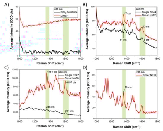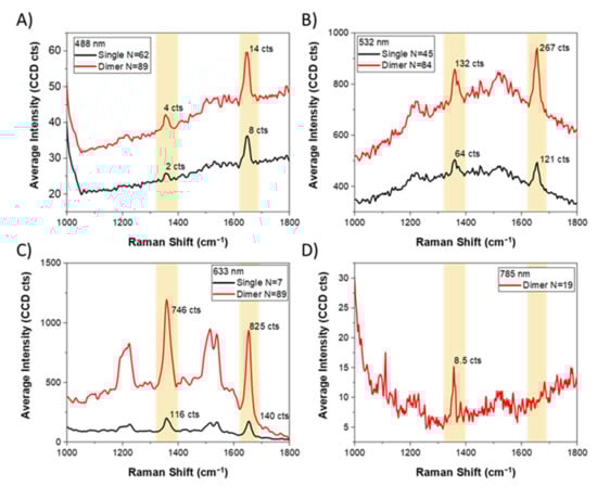 Averaged SERS spectra of self-assembled dimers or single nanoparticles composed of 60 nm AuNPs modified with Cy5, collected from the correlated data. In the insets, the number of spectra that were used to obtain the average data is given. The exciting wavelengths used were (A) 488 nm, (B) 532 nm, (C) 633 nm and (D) 785 nm. In all Raman experiments, the laser power was kept at 300 µW and the integration time was 2 s.