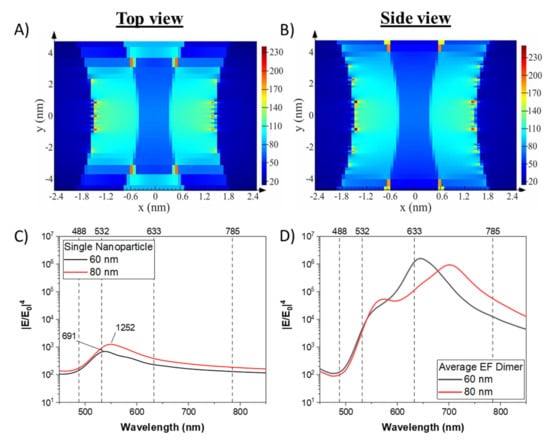 The simulated field enhancements for all the wavelengths used for the Raman analysis are given in Figures S5 and S6 of the Supplementary Materials. Considering the hot spot to be a rectangle and a minimum |E/E0| value of 120 to delimit the maximum area, we obtain for the 60 nm dimers ~24 nm2 and the 80 nm dimer ~56 nm2 of the hot spot area at 633 nm (Figure S5).